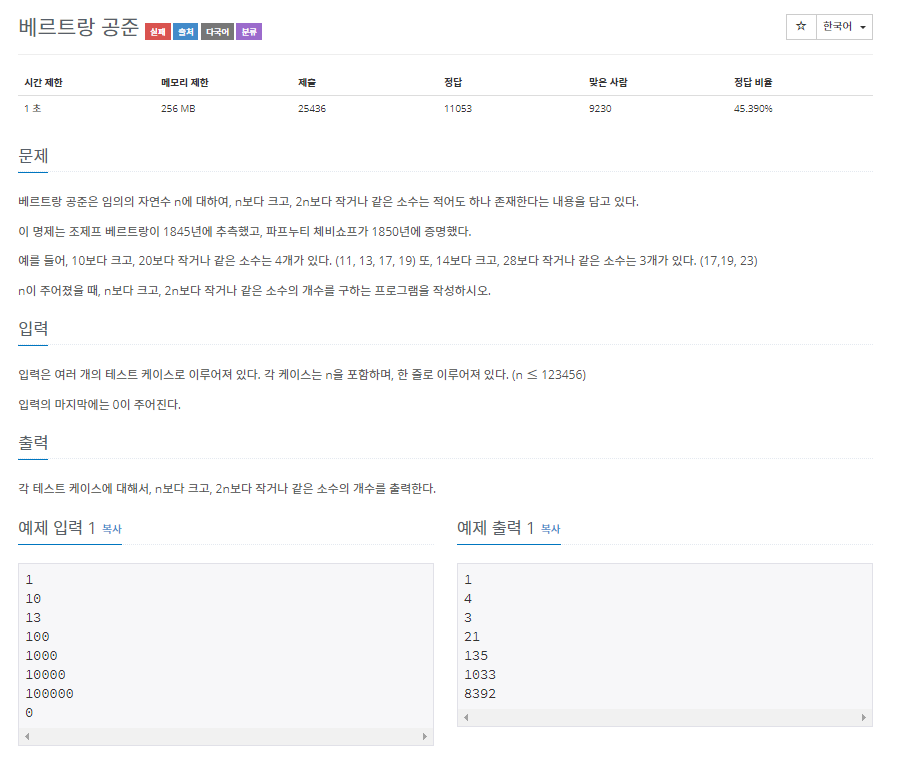 처음에는 위 문제를 접하고 너무 쉽다고 생각하여 코드를 막 적어보았다. 저번 1929번 문제랑 비슷하게 범위를 N보다 크고 2N보다 작은 범위로 설정하고 While 반복문으로 무한루프를 만들어 예제입력과 같이 1부터 10000까지 입력하고 0을 입력하였을때 종료하도록 하였다. 출력은 재대로 나왔지만 아니나 다를까 시간초과가 떳다.